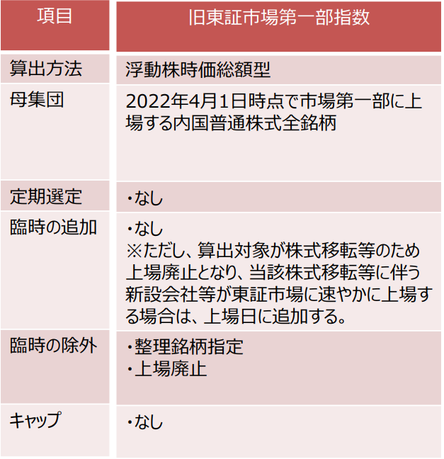 | 2022年4月1日時点で市場第一部に上場する内国普通株式全銘柄を対象に 浮動株時価総額型にて算出する指数。定期的な選定はしない。追加もない。 除外される銘柄は、「整理銘柄指定」「上場廃止」になった銘柄 |