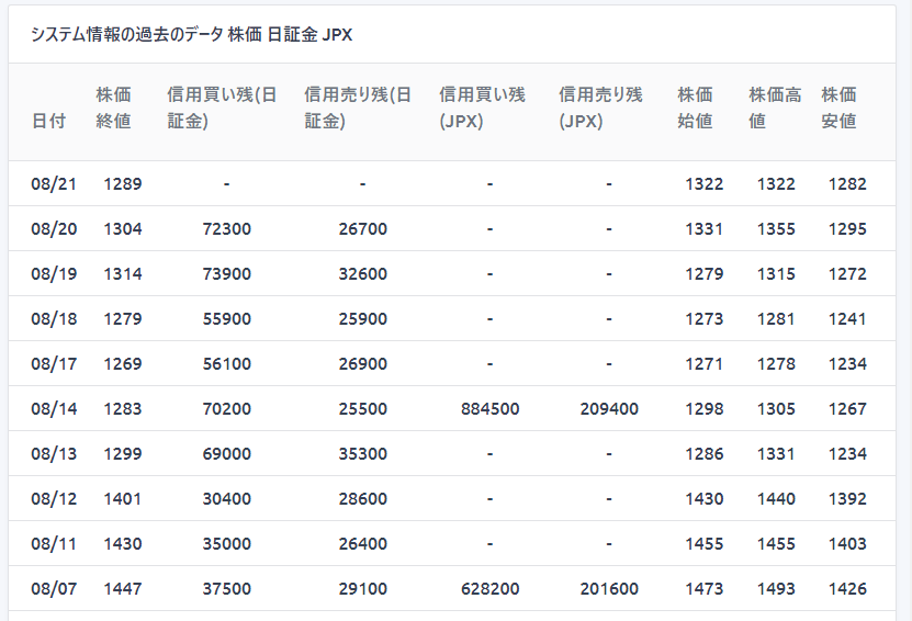JPXの信用買い残増加傾向ですね(8/7 → 8/14)