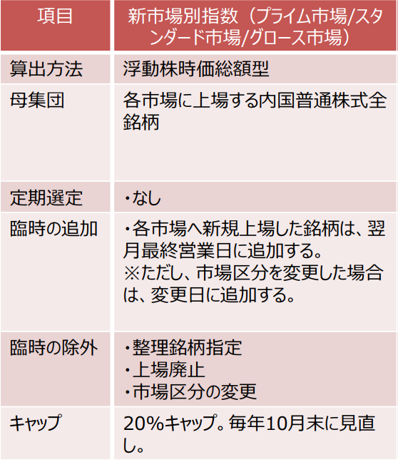 | 東証スタンダード市場に上場する内国普通株式全銘柄を対象に 浮動株時価総額型にて算出する指数。定期的な選定はしない。新規上場した銘柄は、翌月最終営業日に追加。 除外される銘柄は、「整理銘柄指定」「上場廃止」「市場区分の変更」になった銘柄 |